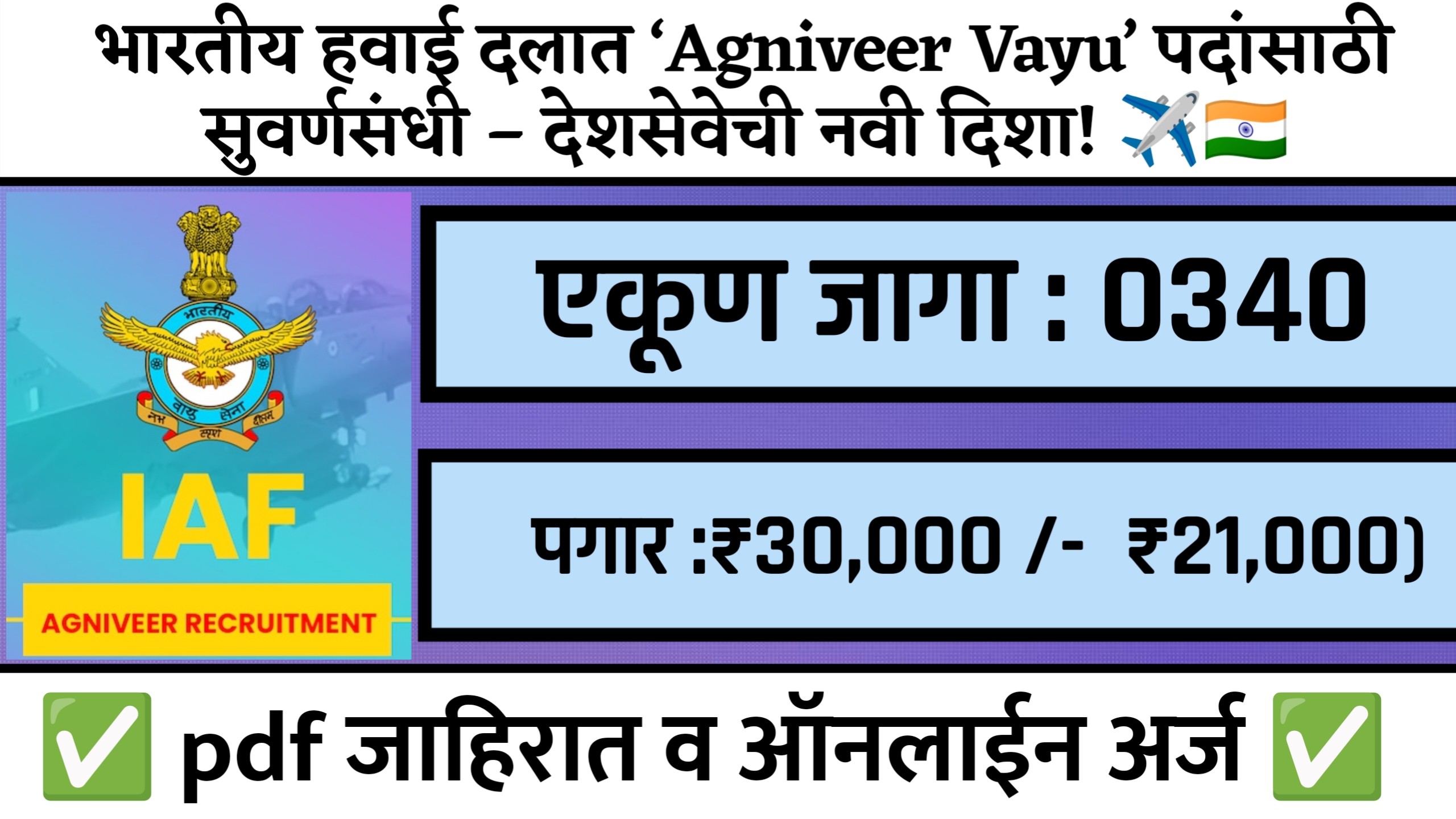 IAF Sky Guardians 2026 – भारतीय हवाई दल AFCAT 2025 (भारतीय हवाई दल AFCAT 2026) 340 कमिशन्ड ऑफिसर पदांसाठी. हवाई दल कॉमन अॅडमिशन ऑनलाइन टेस्ट (AFCAT) 01/2026: जानेवारीमध्ये सुरू होणारे NCC स्पेशल एंट्री कोर्सेस उमेदवारांकडून ऑनलाईन पद्धतीने अर्ज मागविण्यात येत आहेत.सदर भरतीसाठी उमेदवारांना 14 डिसेंबर 2025 पर्यंत आपले अर्ज करता येणार आहेत.भरती संदर्भात सविस्तर माहिती तसेच यासाठी लागणारी शैक्षणिक पात्रता यांची माहिती खाली दिलेली आहे.