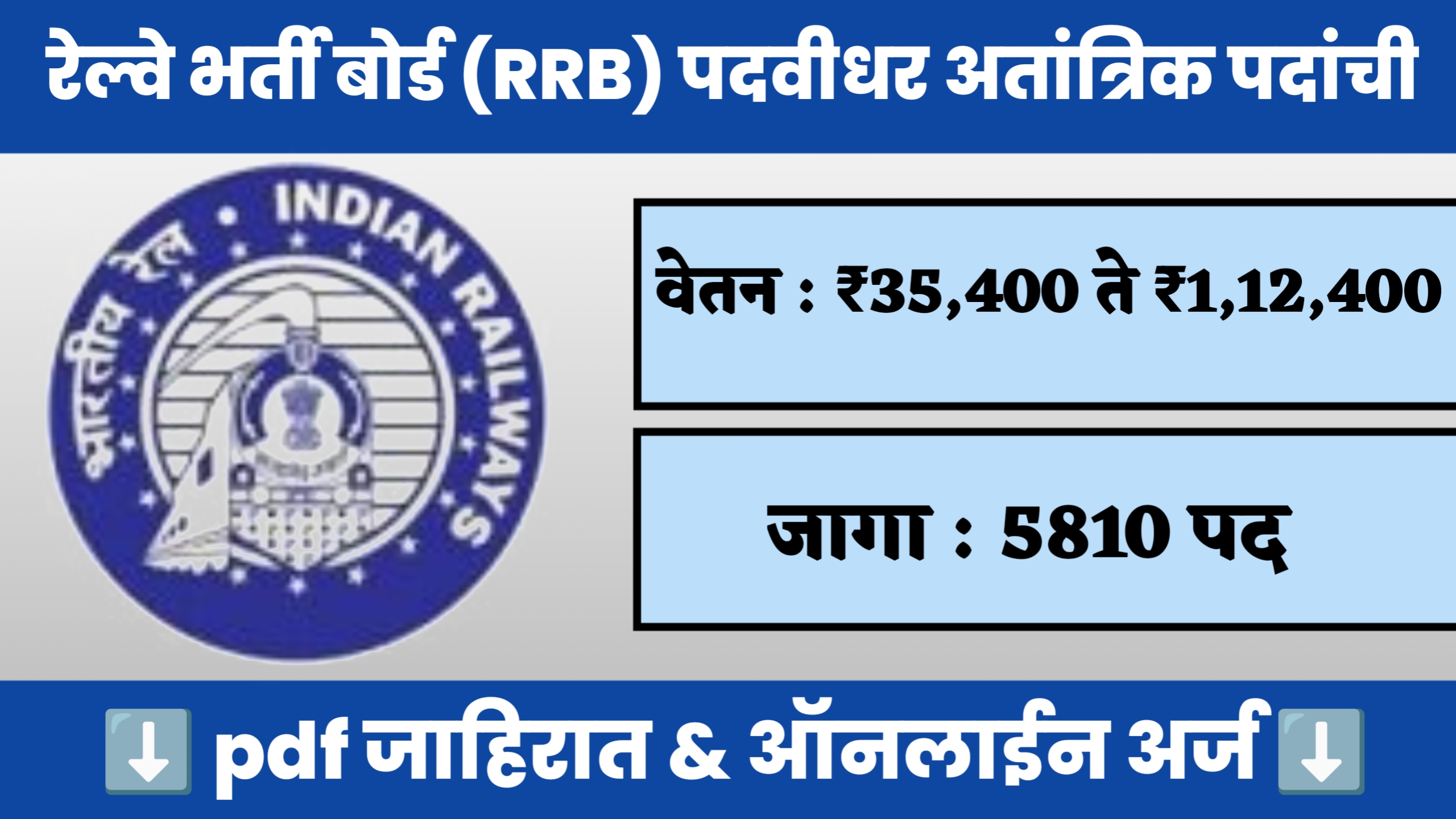 RRB Recruitment 2025: 5810:भारतीय रेल्वे भर्ती बोर्ड (NTPC) यांच्यामार्फत विविध रेल्वे विभागाच्या आस्थापनेवरील विविध अतांत्रिक पदांच्या एकूण ५८१० जागा भरण्यासाठी पदांनुसार पात्रताधारक असणाऱ्या उमेदवारांकडून ऑनलाईन पद्धतीने अर्ज मागविण्यात येत आहेत.nsnokari.com