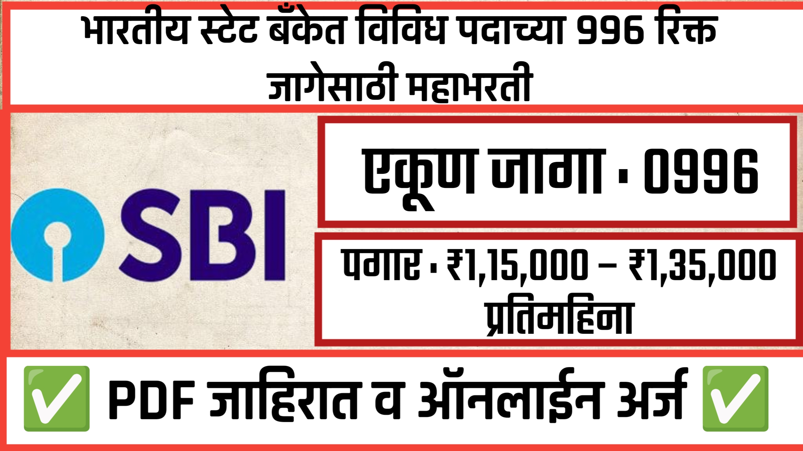 SBI New Pro Hiring 2025 – Specialist Officer Mega Bharti 996 Posts update : State Bank of India (SBI) has announced recruitment for various posts. The last date for submission of applications is December 23, 2025.